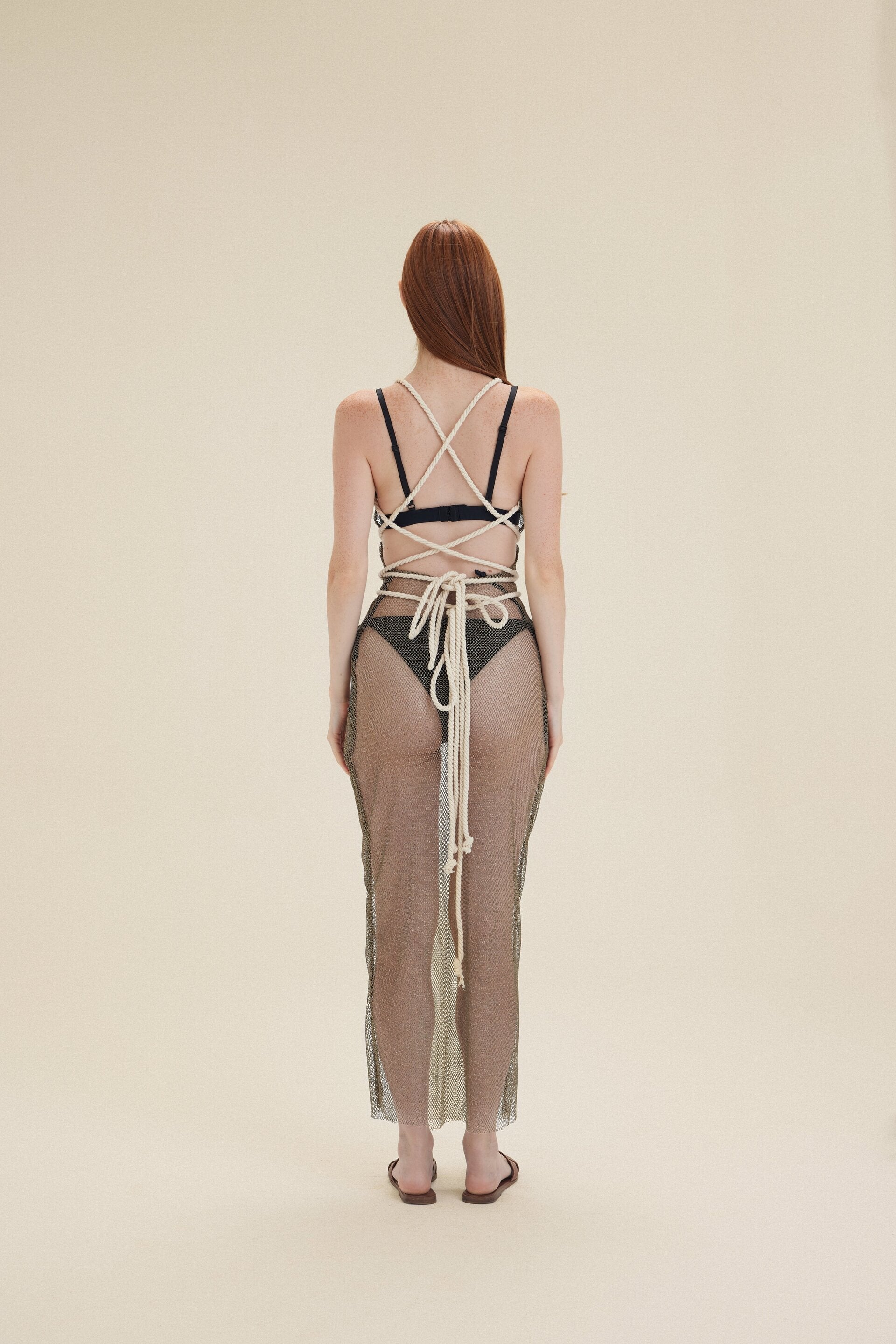 This striking piece features a bold fishnet design in a versatile army green, creating a daring yet sophisticated look. The dress is complemented by a long off-white ribbon that ties at the waist, adding a touch of refinement and versatility.