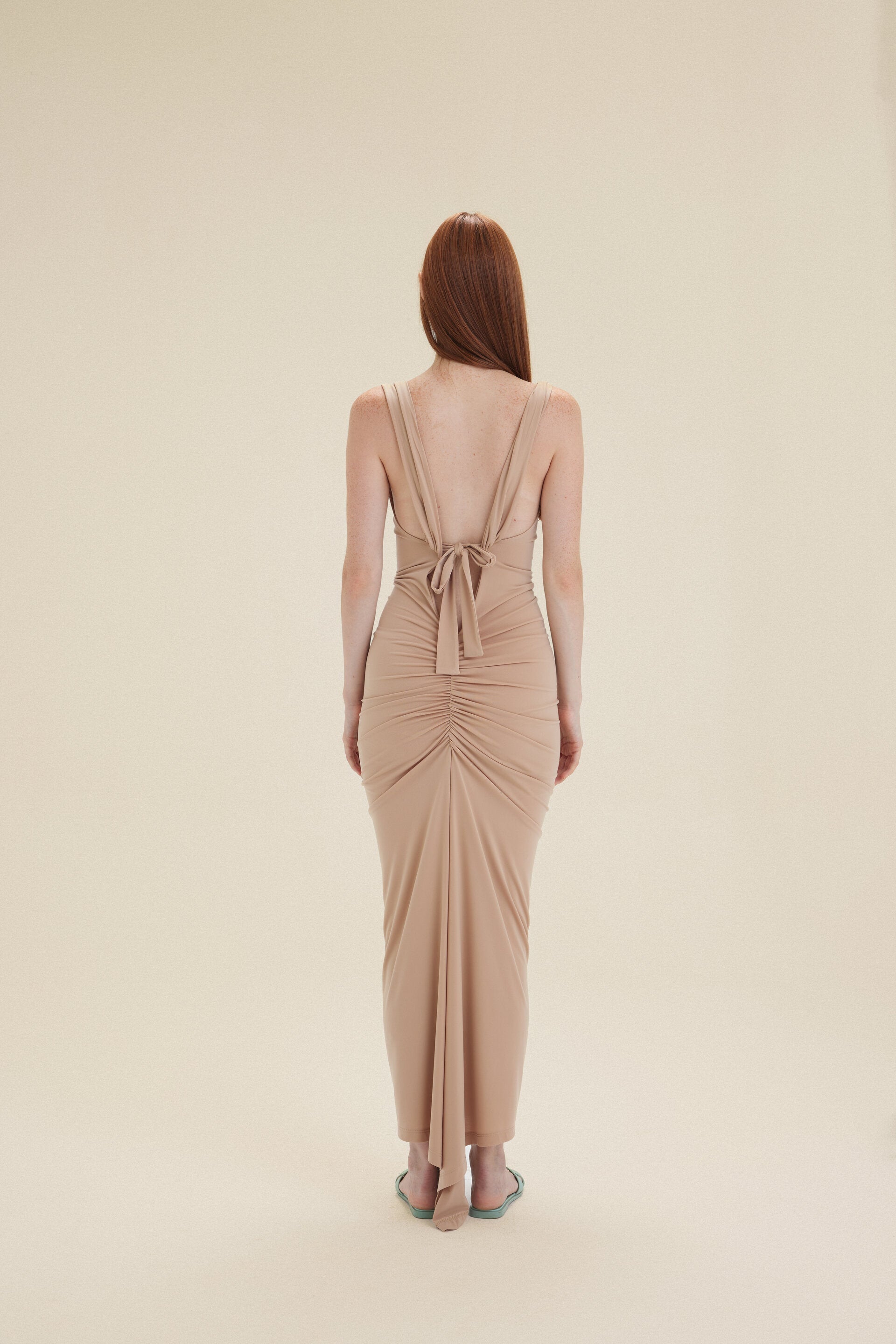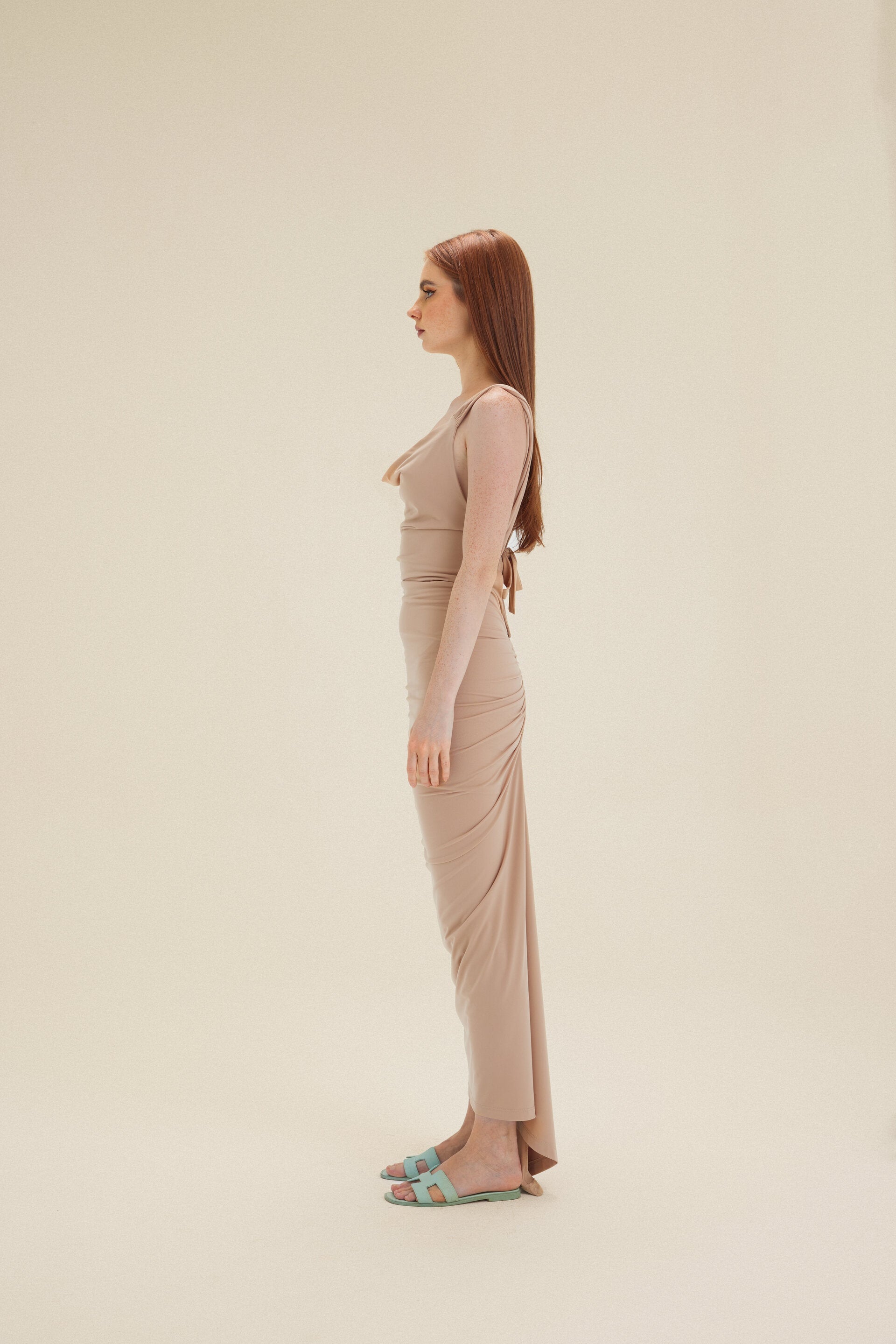 This Beige Sculpt Cowl Neck Fitted Maxi Dress, where modern design meets classic elegance. This striking dress features a sculpted silhouette that contours the body for a flattering, streamlined look. The draped cowl neck adds a touch of sophistication and fluidity, enhancing the overall allure.