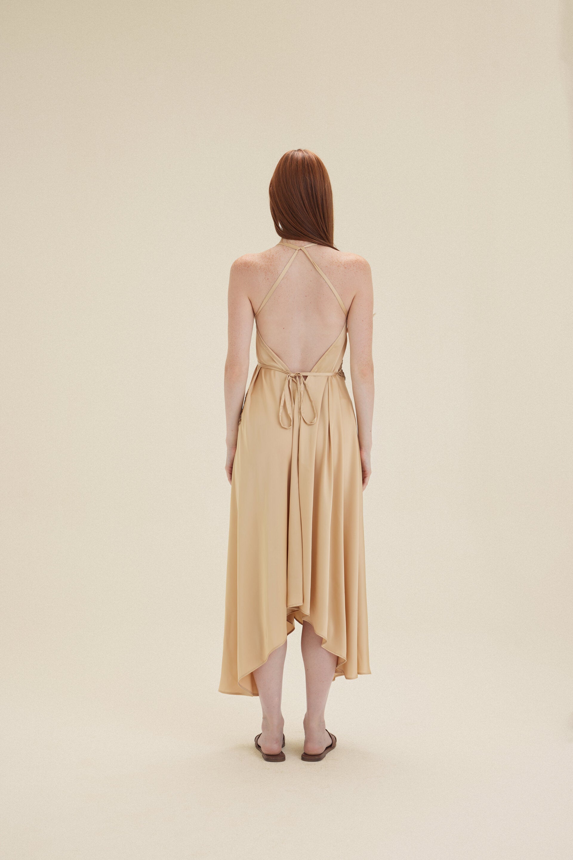 A stunning embodiment of luxury and craftsmanship. This dress is crafted from sumptuous gold silk that catches the light with every movement, creating a radiant and elegant silhouette. The intricate Italian batch work leather detailing adds a sophisticated touch of texture and opulence, enhancing the overall design. A matching gold ribbon, made from the same silk fabric, cinches at the waist to accentuate your figure and complete the look.