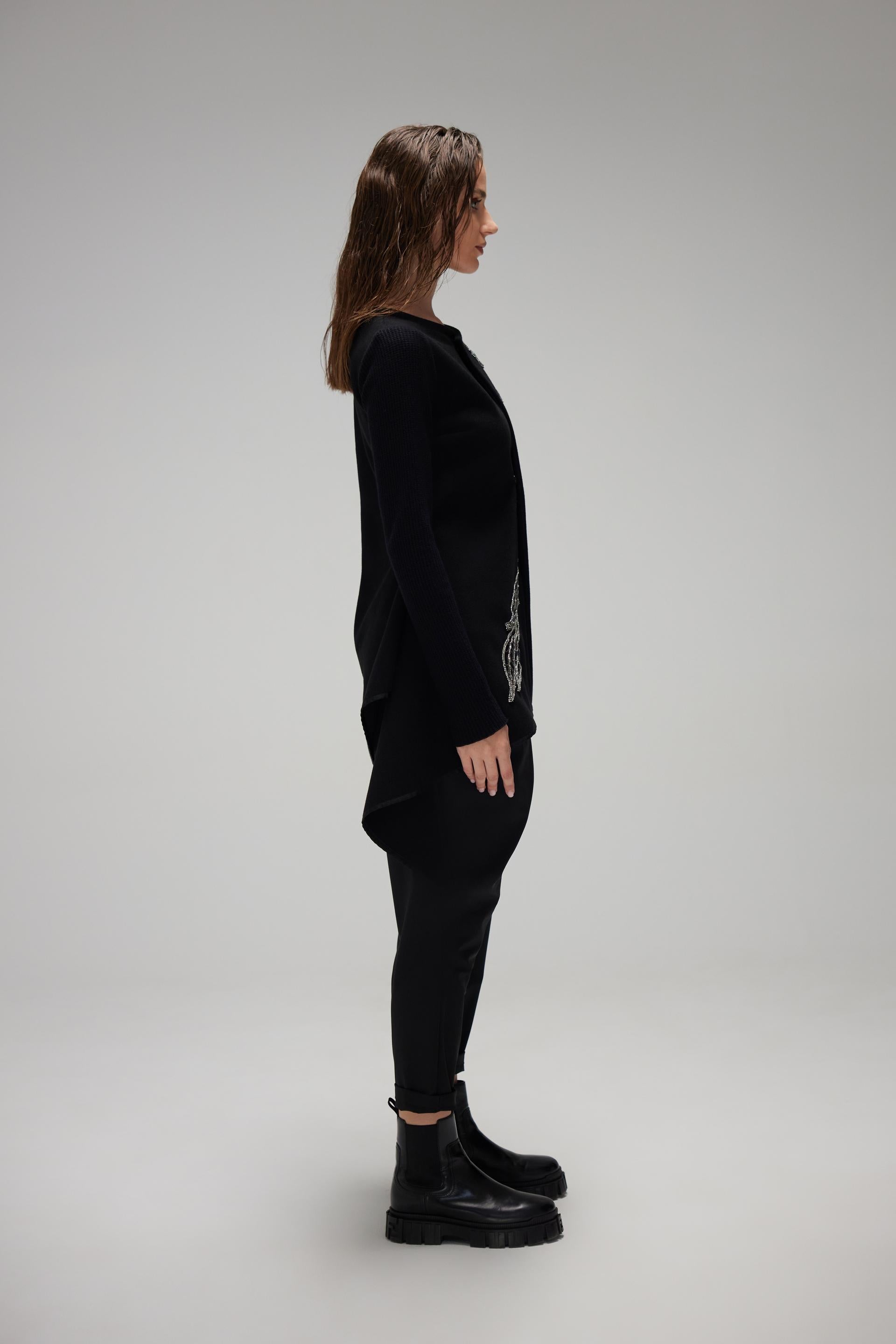 This embroidered black jacket is crafted from a combination of luxurious gogh and wool fabrics. The contrasting textures of these materials create a visually striking and tactile piece that is sure to turn heads. The jacket features a unique design with the sleeves made from soft and cozy wool fabric, The rest of the jacket is made from gogh fabric. Delicate leaves, intricately stitched with shiny diamonds, adorn the front of the jacket.