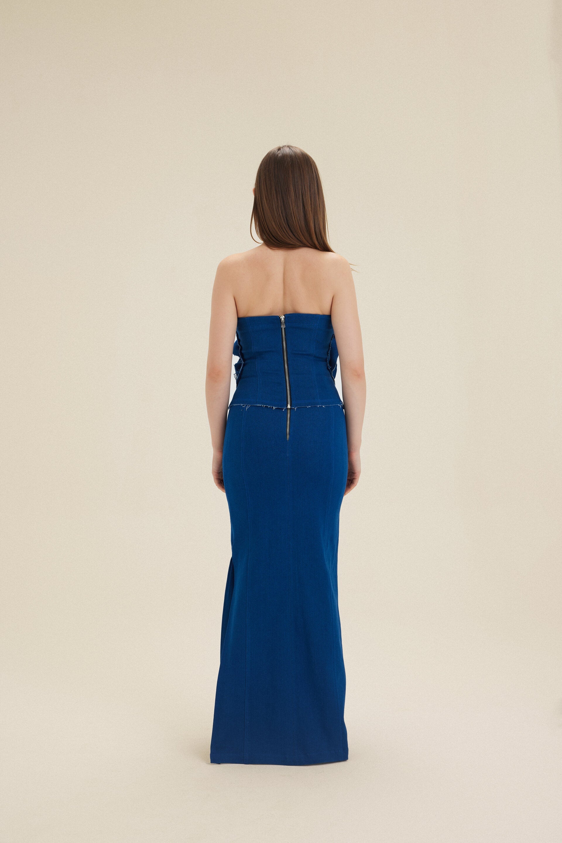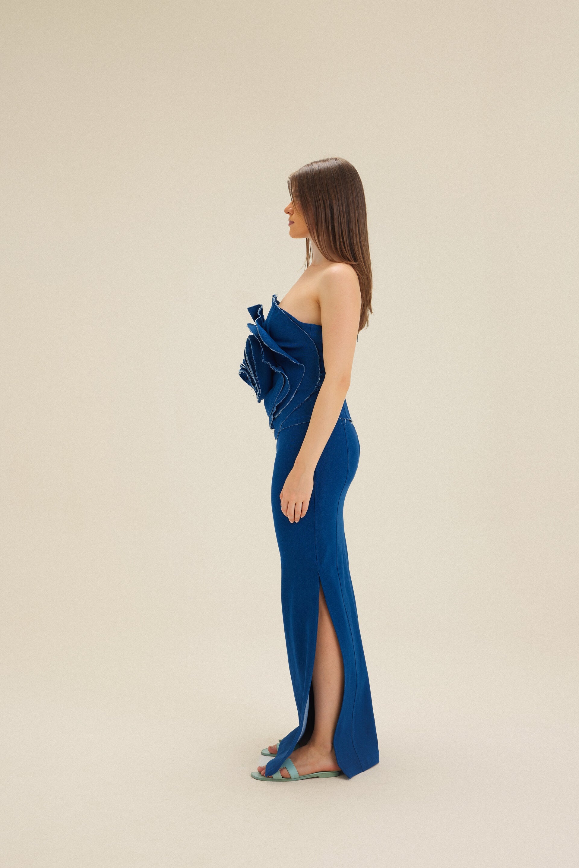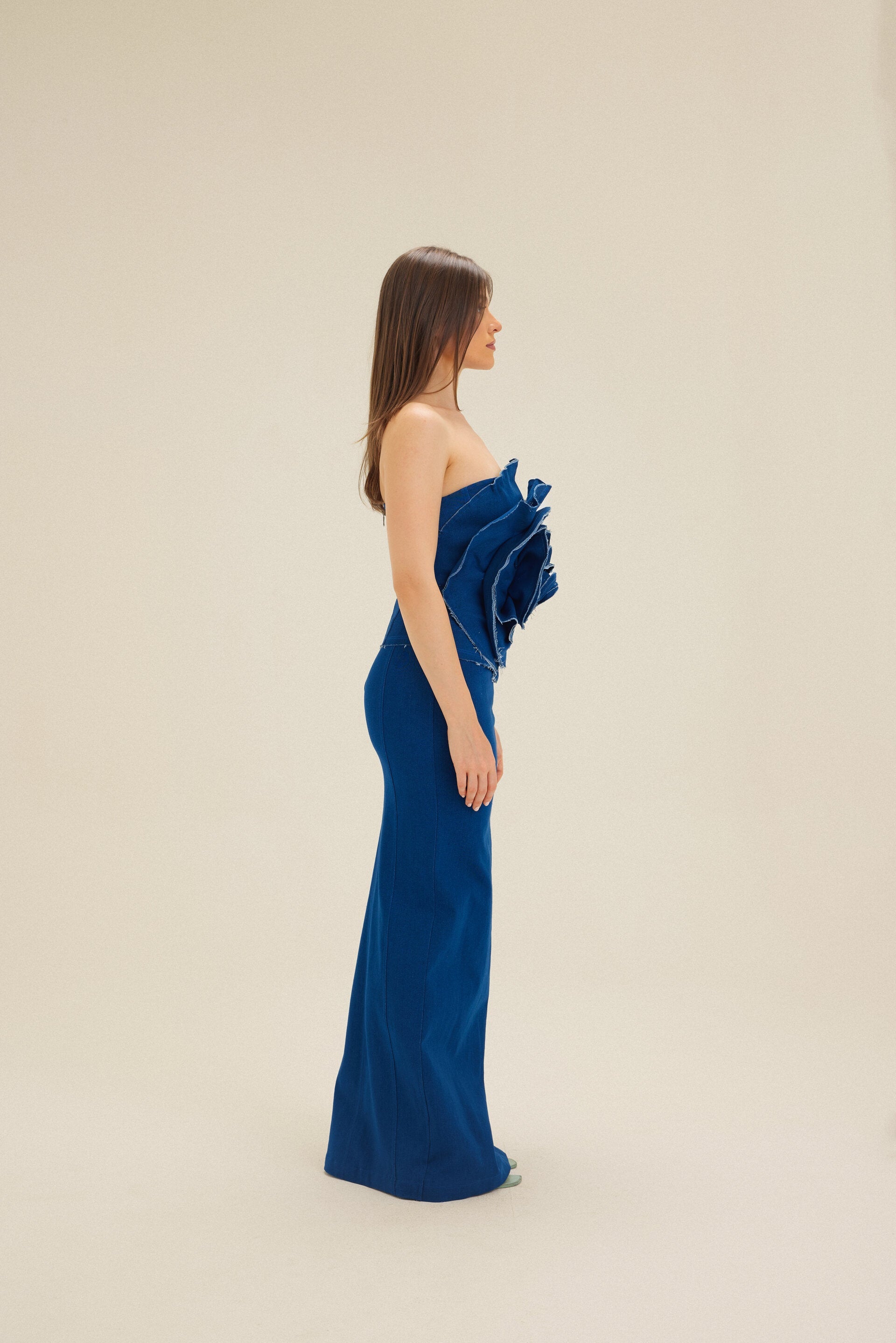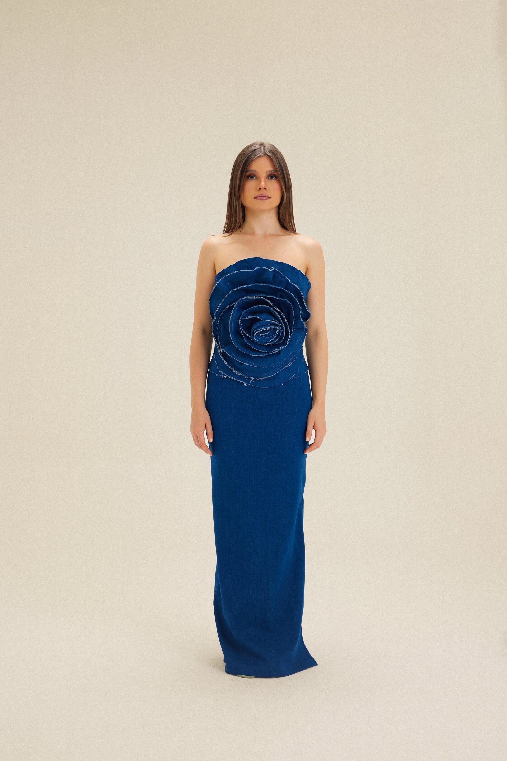 Our new blue flower denim set, featuring a striking tube top adorned with a bold, huge flower in matching denim fabric. Paired with a flowing maxi skirt, this ensemble blends modern elegance with a touch of whimsical charm, perfect for making a stylish statement.