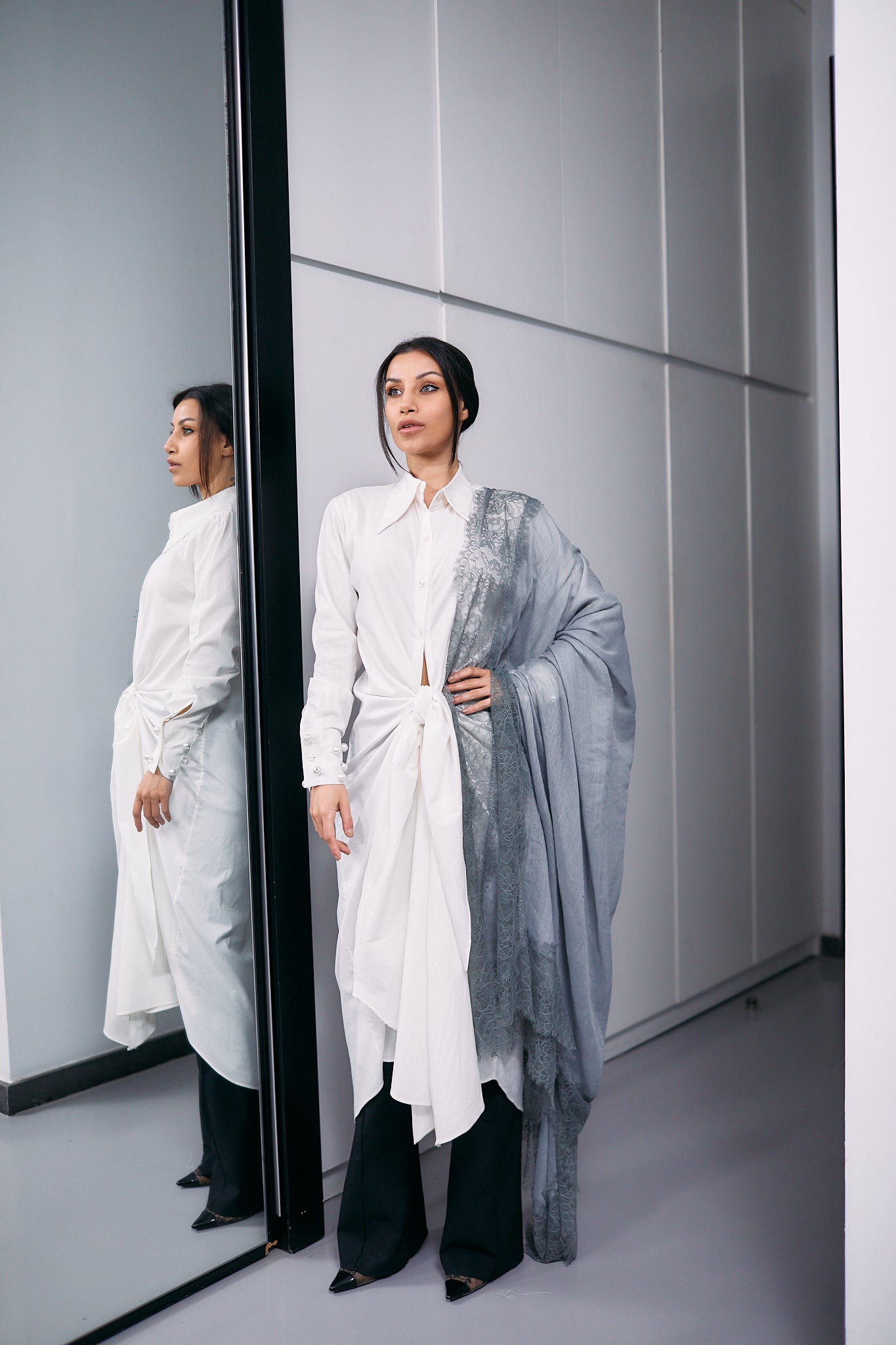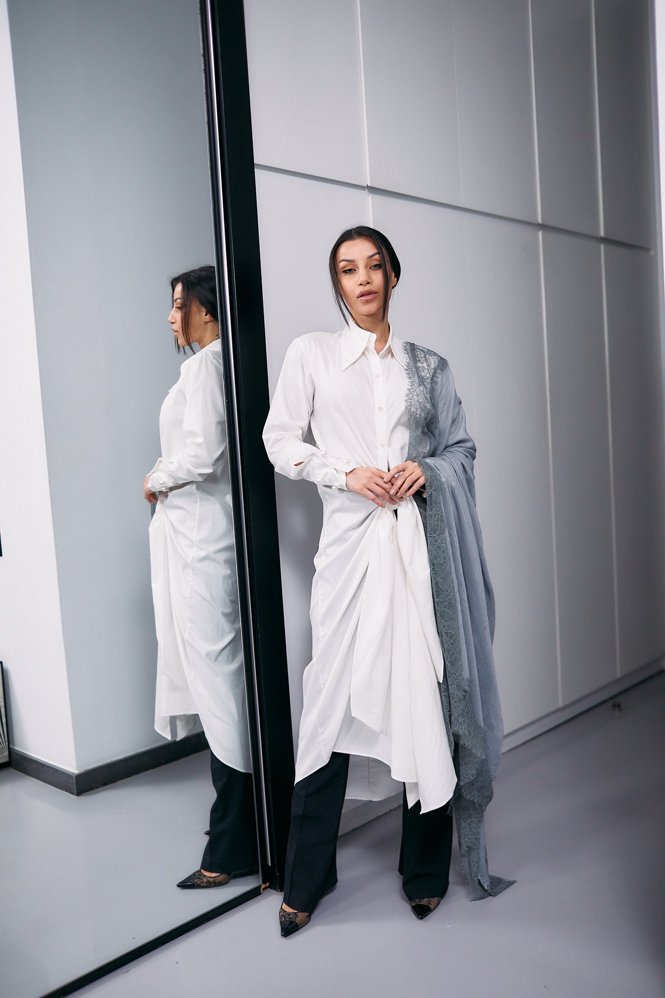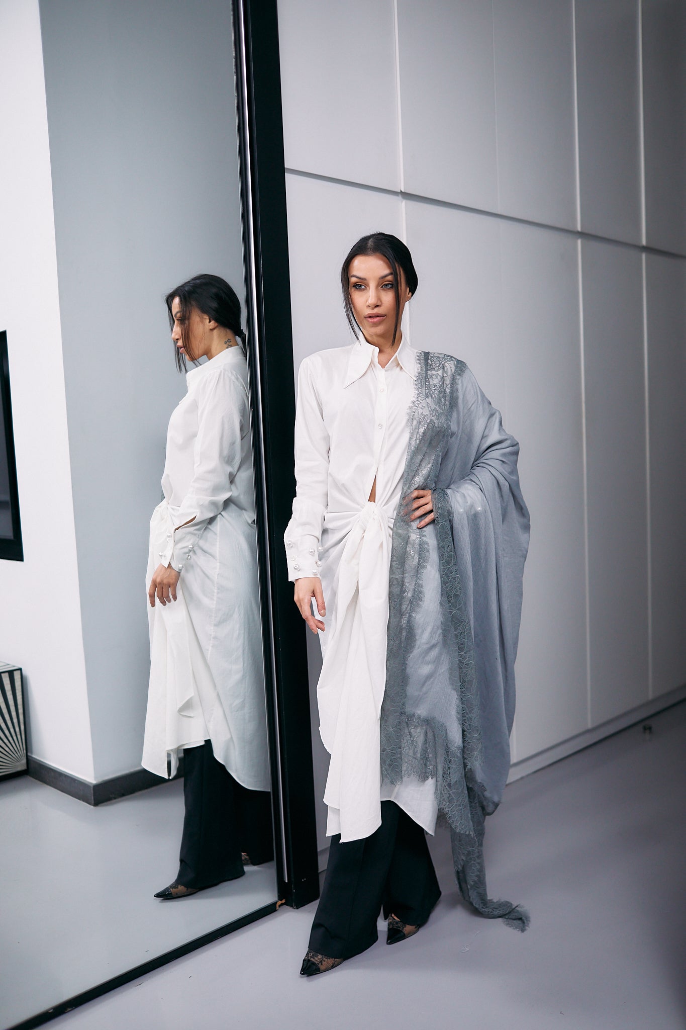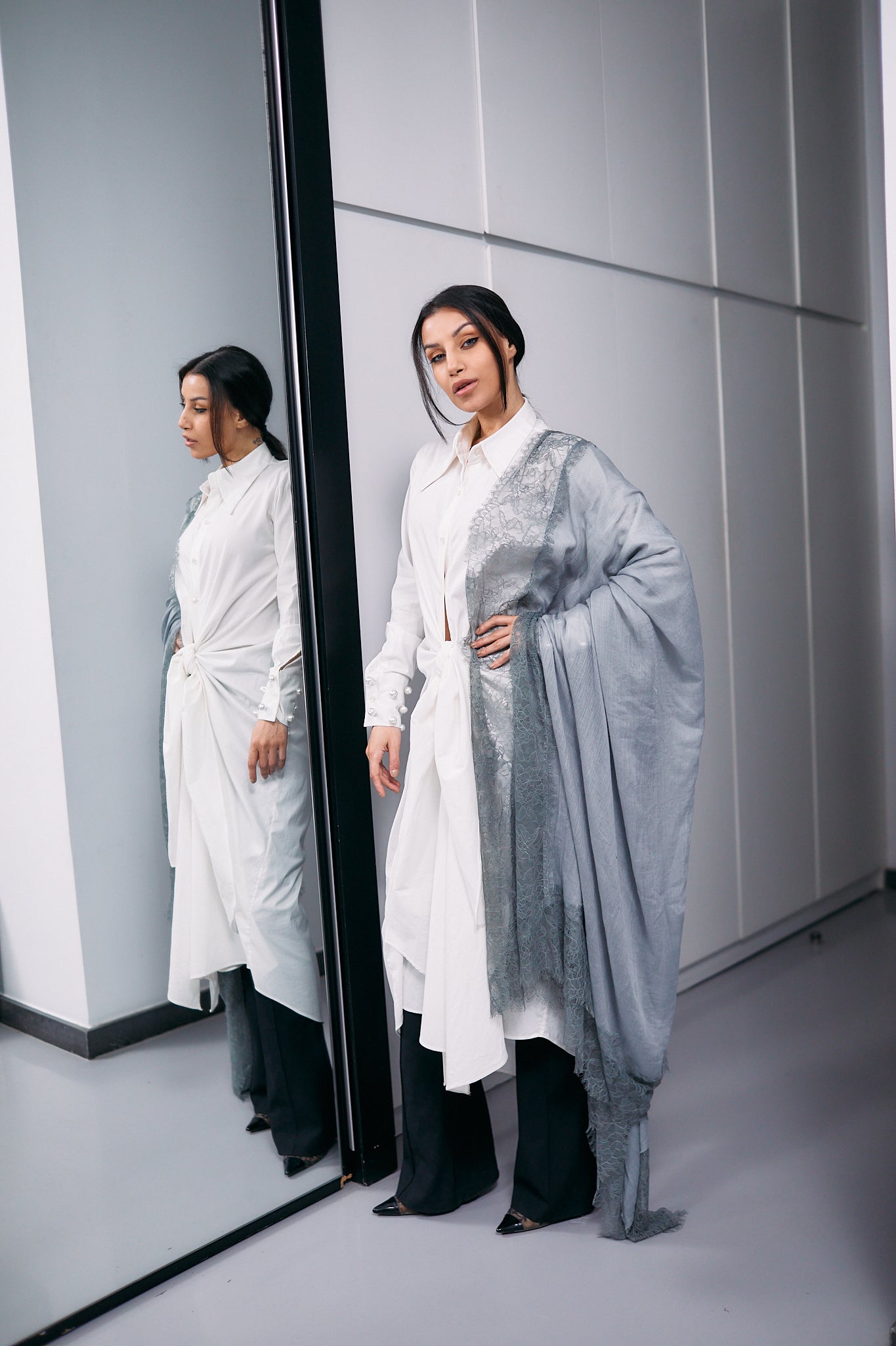 This luxurious grey cashmere scarf is adorned with intricate grey Italian dantel, adding a touch of sophistication and elegance to any ensemble.