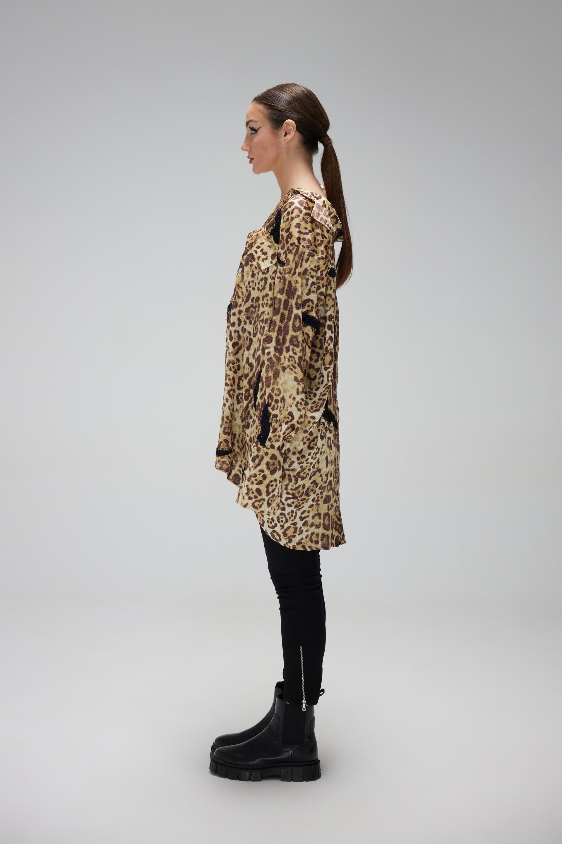This printed leopard back slit shirt is a unique and luxurious piece crafted from satin fabric. The intricate bird embroidery in black threads adds a touch of elegance and sophistication to the design.