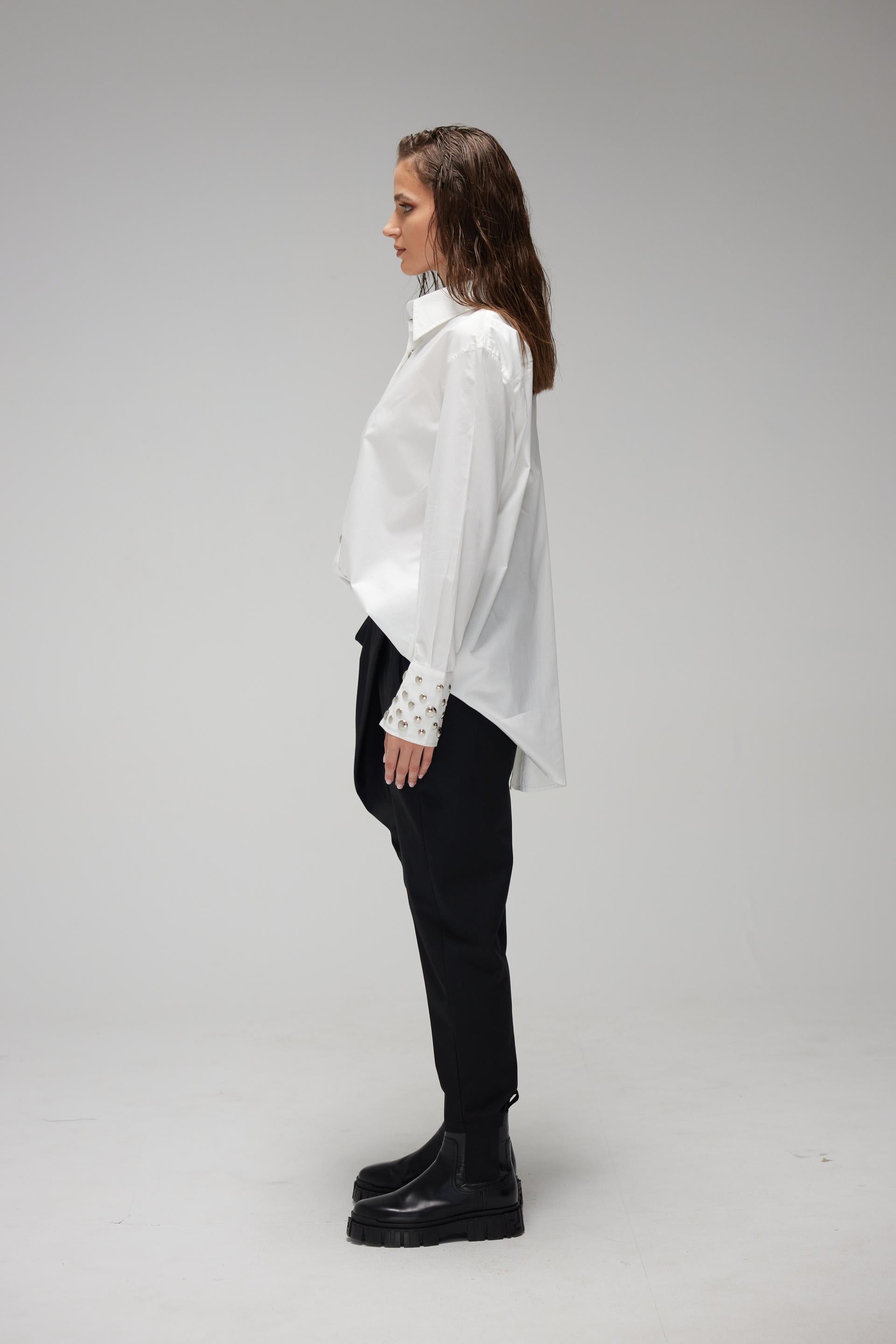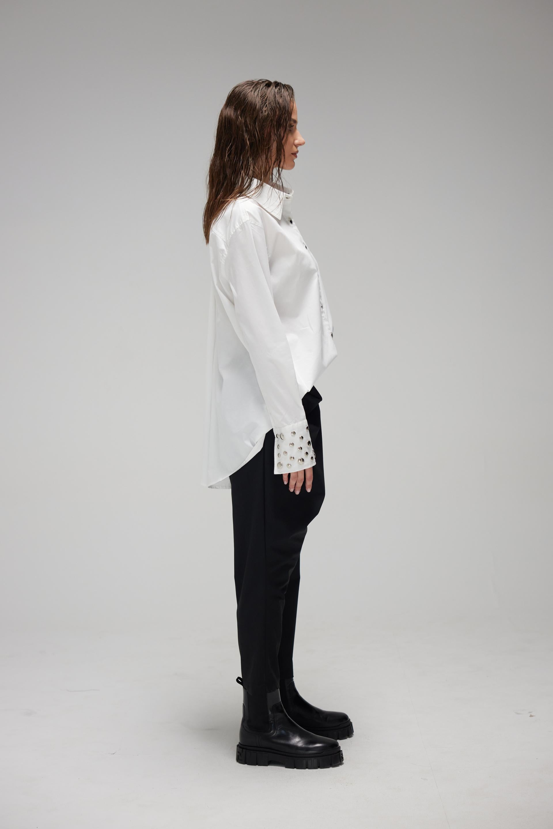 This optic white shirt from Dunia Anabtawi features Adding a touch of edginess to the shirt are the stud buttons, which replace the traditional buttons and create a striking visual impact. Completing the ensemble are the studded braclets. These bracelets feature the same studs as the buttons on the shirt, creating a cohesive and coordinated look.